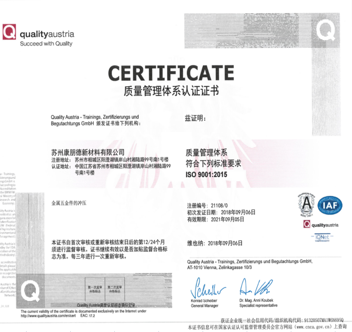 為了更好的使產品質量得到控制,使顧客更加滿意,內部管理水平得以提升,降低企業(yè)的管理成本并提高公司的工作效率,蘇州康朋德大力在內部推行ISO體系,讓公司管理更加系統和規(guī)范。并于2018年9月6日取得了認證。
